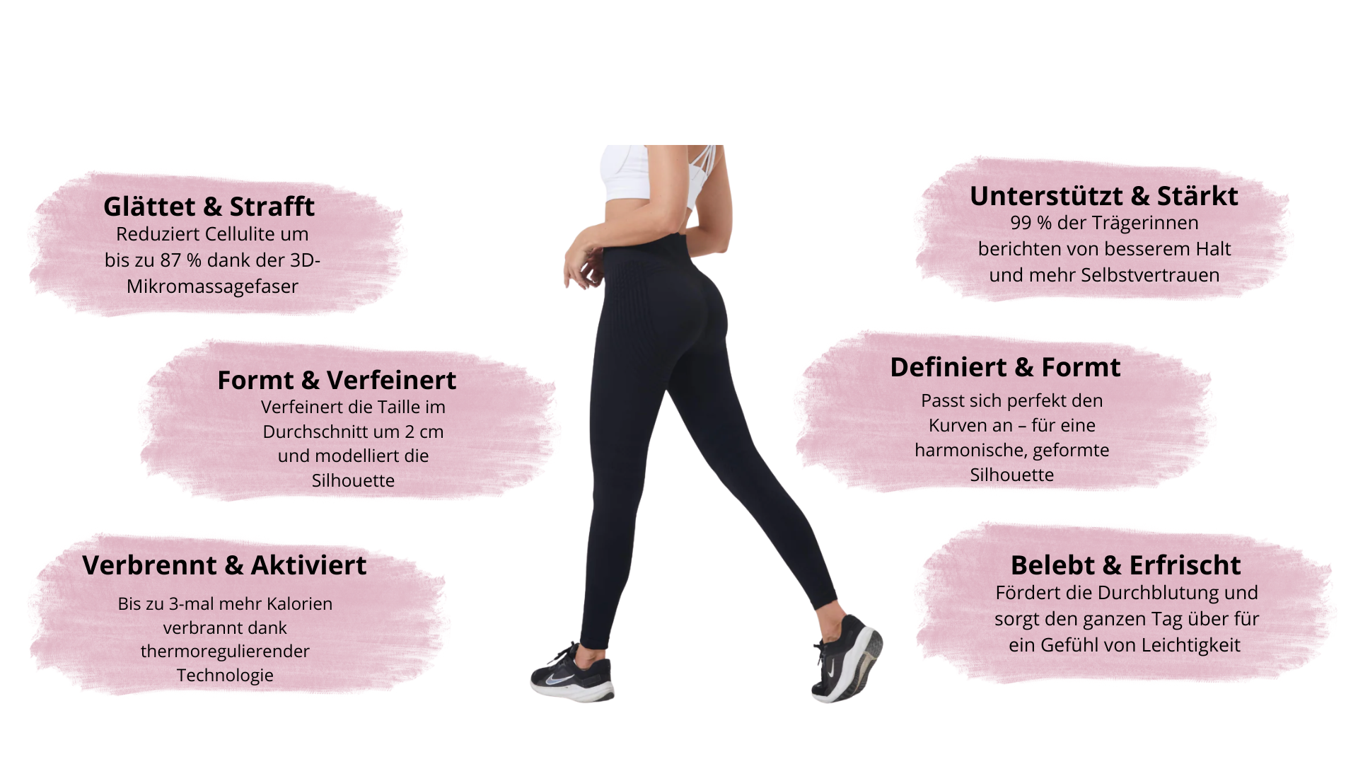 „Ich war überrascht: Schon nach zwei Wochen waren weniger Unregelmäßigkeiten zu sehen. Die Leggings gleicht die Unregelmäßigkeiten wirklich aus und sorgt für einen glättenden Effekt. Ideal für den Alltag oder zum Training.“